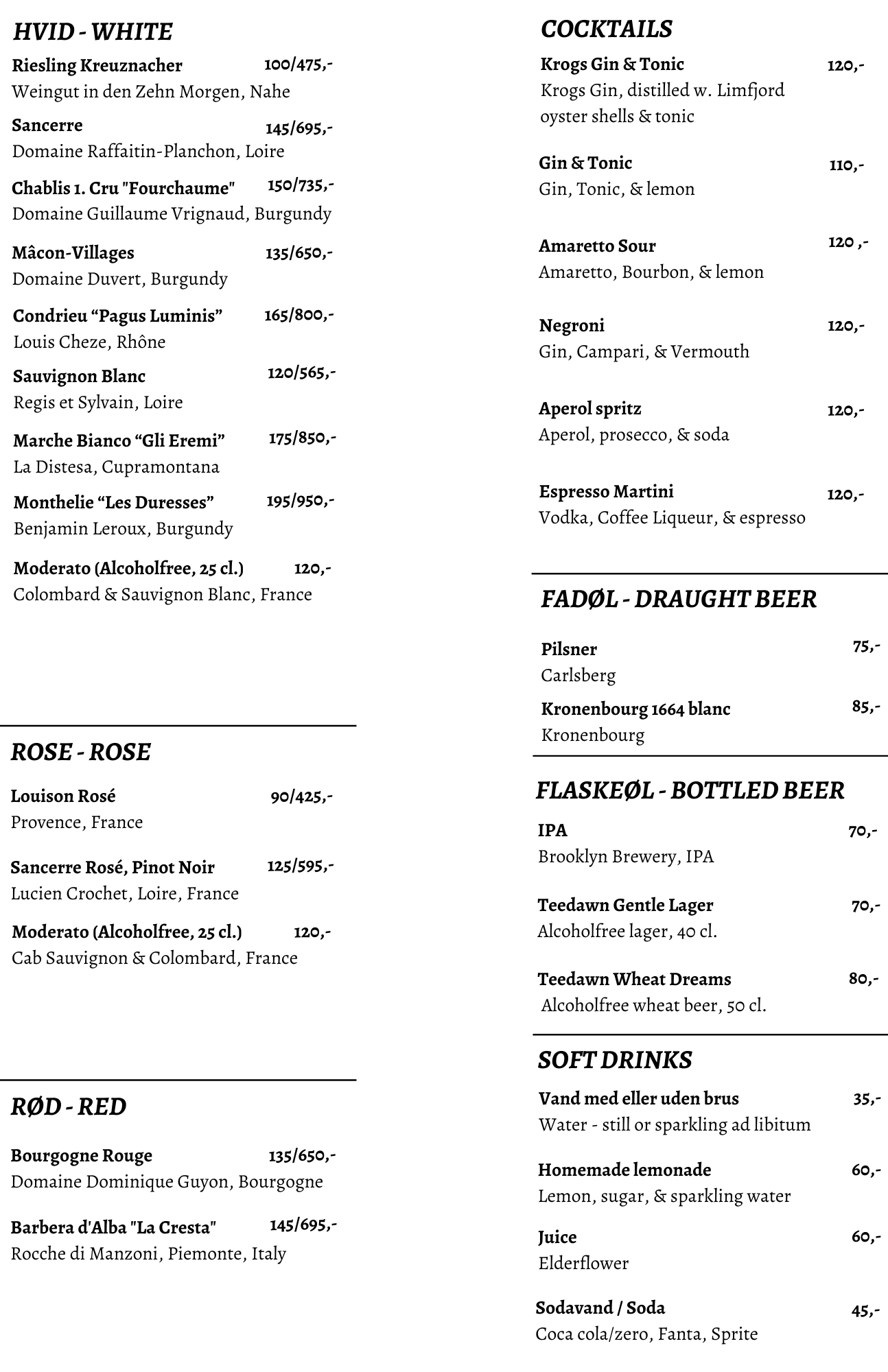 The colder season has arrived, and Lille Krogs is open for cozy drinks and light snacks on the terrace. When spring returns, so will our casual seafood for lunch and dinner.